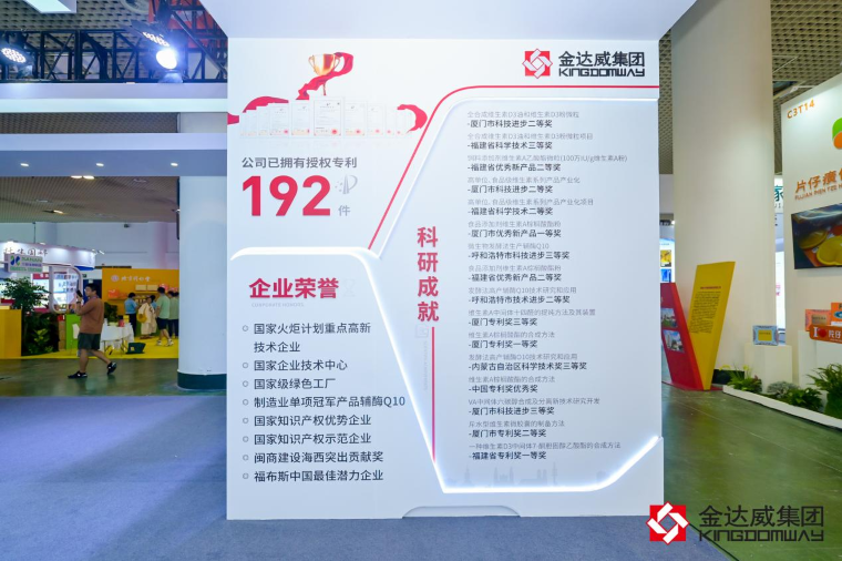 依托多年技术积累,金达威集团以合成生物学为底层创新引擎,打造微生物发酵与生物酶催化为双轮驱动的核心生物制造平台,叠加化学合成为重要支撑,形成了从分子设计到绿色制造的完整技术链条。公司获评“国家制造业单项冠军企业”(辅酶Q10),其“生物合成辅酶Q10关键技术与产业化”项目更获2022年中国轻工业联合会科技进步一等奖。截至2025年6月30日,公司共拥有有效授权专利192件(其中含中国专利180 件,美国专利12件)。凭借突出实力,公司先后获得“国家火炬计划重点高新技术企业”、“国家企业技术中心”、“国家技术创新示范企业”、“国家知识产权示范企业”等多项国家级资质。