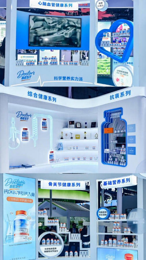 展位上,Doctor’s Best多特倍斯以其标志性的蓝色调+简洁现代展陈设计传递出“科学、健康、活力”的品牌基因。本次参展,Doctor’s Best多特倍斯精心呈现了其覆盖心脑血管健康、抗衰、综合健康、基础营养、骨关节健康等五大核心系列产品。